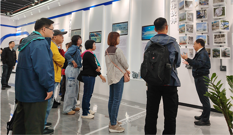 参观伊始,刘绍民董事长带领台湾众孚团队首先走进公司展厅。展厅内,一幅幅记录企业发展历程的照片、一件件彰显核心技术的产品模型,系统呈现了美嘉科技自成立以来的成长轨迹与技术积淀。刘董事长细致讲解了公司在母线、高低压成套设备等领域的研发突破与市场布局,台湾团队成员不时驻足询问,对美嘉科技的发展速度与技术实力表示由衷赞叹,现场交流的氛围在初步的了解中逐渐升温。